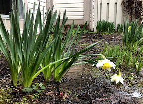 Heavy with rain the faces of daffodils lean down to rest on the wet ground.