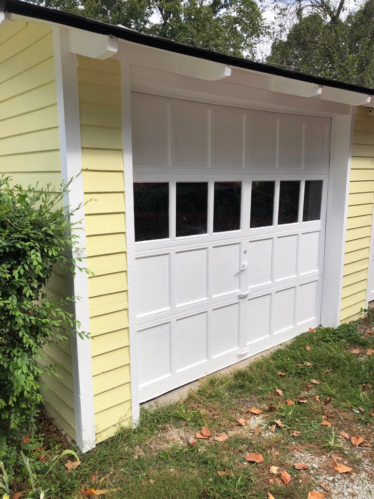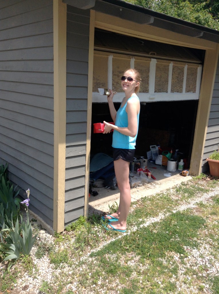 How does the saying begin? “The best of intentions…” Sydney painted one garage door that summer…then returned to school. I think I painted the other garage door that fall. Where Sydney had taken the time to edge around the windows on her door, I did not, preferring the “scrape later” method of edging a window.
